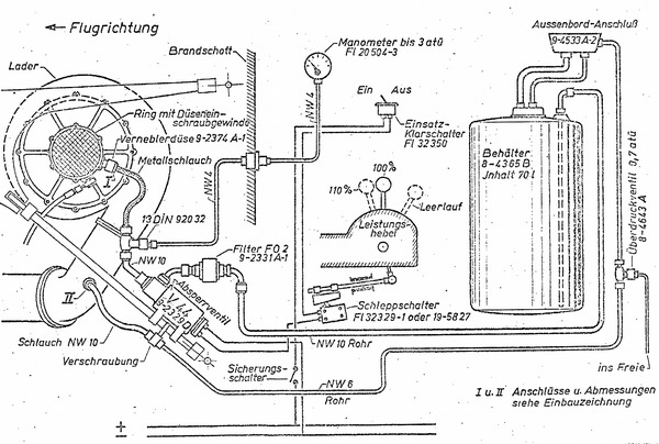 Zweck: Die MW-Anlage dient zur Erhöhung der Notleistung des Flugmotors. Durch die erhöhte Notleistung läßt sich kurzzeitig die Waagerecht- oder die Steiggeschwindigkeit erhöhen. Nach Umrüstung des Motors auf MW-Betrieb ist Entnahme der "Start- und Notleistung" nicht mehr möglich; es muß mit "Steig- und Kampfleistung" gestartet werden. Wirkungsweise: Der MW-Stoff ist ein Gemisch aus Methanol und Leitungswasser, dem Korrosionsschutzöl zugesetzt ist. Der MW-Zusatz bewirkt Innenkühlung des Motors zur Vermeidung von Überhitzungen bei Entnahme der Sondernotleistung. Der MW-Stoff wird durch Ladedruck aus dem Vorratsbehälter (Bordbehälter) zur Verneblerdüse am Laderschacht gedrückt und mit der Ladeluft den Zylindern zugeführt. Schalt- und Überwachungsanlage: Betätigung des Schaltventils zur Ein- und Ausschaltung der MW-Zufuhr elektrisch; Kippschalter (Einsatzklarschalter) auf Führergerätebrett. Das Schaltventil öffnet jedoch erst dann, wenn der Gashebel über die Sperrung hinaus in seine vorderste Stellung geschoben wird (gashebelgekuppelter Druckknopfschalter). Die Schaltanlage ist über einen Selbstschalter an der Hauptschalttafel an das Bordnetz angeschlossen. Überwachung des MW-Druckes durch Druckmesser im Führergerätebrett. Entnahme der Sondernotleitung: Der MW-Zusatz kann beim DB 605 AS bis zu einer Flughöhe von 8,5 km entnommen werden; in Höhen über 8,5 km ist durch MW-Zusatz keine Leistungssteigerung mehr zu erzielen, sondern nur MW-Stoff unnötig verbraucht. Die Sondernotleistung darf höchstens 10 Minuten entnommen werden. Bis zur nächsten Entnahme ist eine Pause mit geringerer Motorleistung von mindestens 5 Minuten einzuschalten. Einsatzzeit: 75 Liter MW-Vorrat reicht für 26 Flugminuten aus. Quelle: L. Dv. T. 2109 G-14/Fl MW-Anlage-Karte Bf 109 G-14 Stand Oktober 1944 (gekürzter Auszug) Abbildung zeigt Schema der MW50 Anlage für DB 605, Stand Juni 1944. |